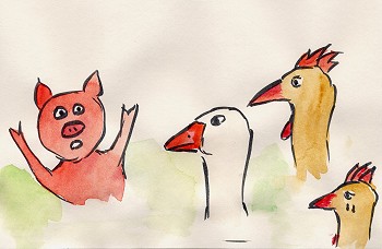 Genau in diesem Moment kam plötzlich einer von Paulis Menschen auf die Schweinegruppe zugelaufen. Er hatte noch Messer und Gabel in der Hand und schien gierig auf mehr Schweinefleisch.